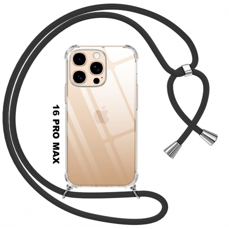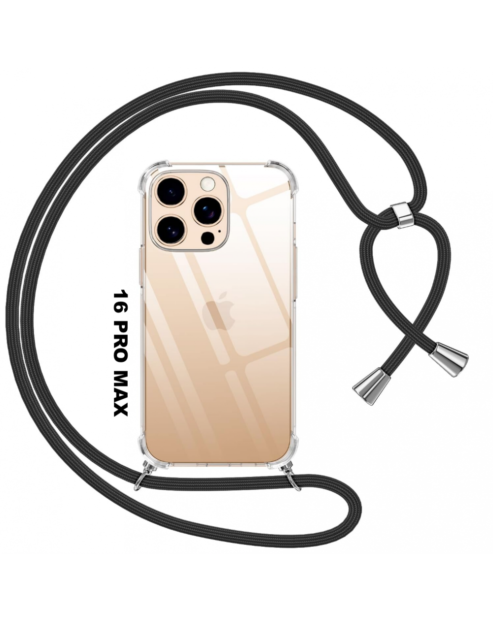 La Funda Con Cuerda Reforzada Para iPhone 16 Pro Max está hecha de un material ligero y cuerda negra de nylon ajustable.