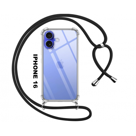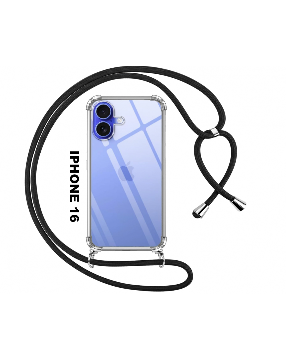 La Funda Con Cuerda Reforzada Para iPhone 16 está hecha de un material ligero y cuerda negra de nylon ajustable.