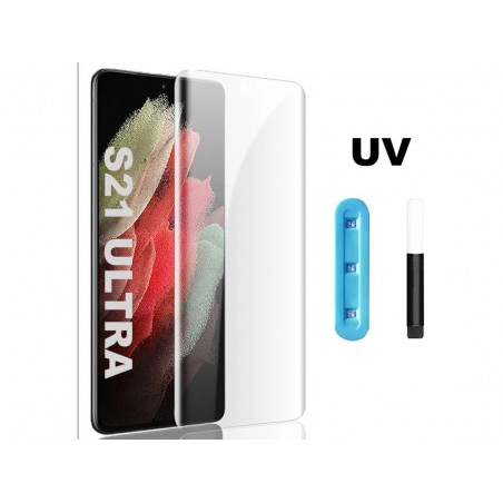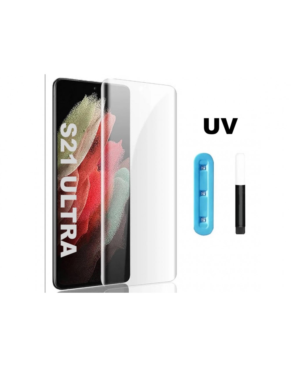 Pantalla protectora de cristal templado fijado con luz UV para Samsung S21 Ultra.